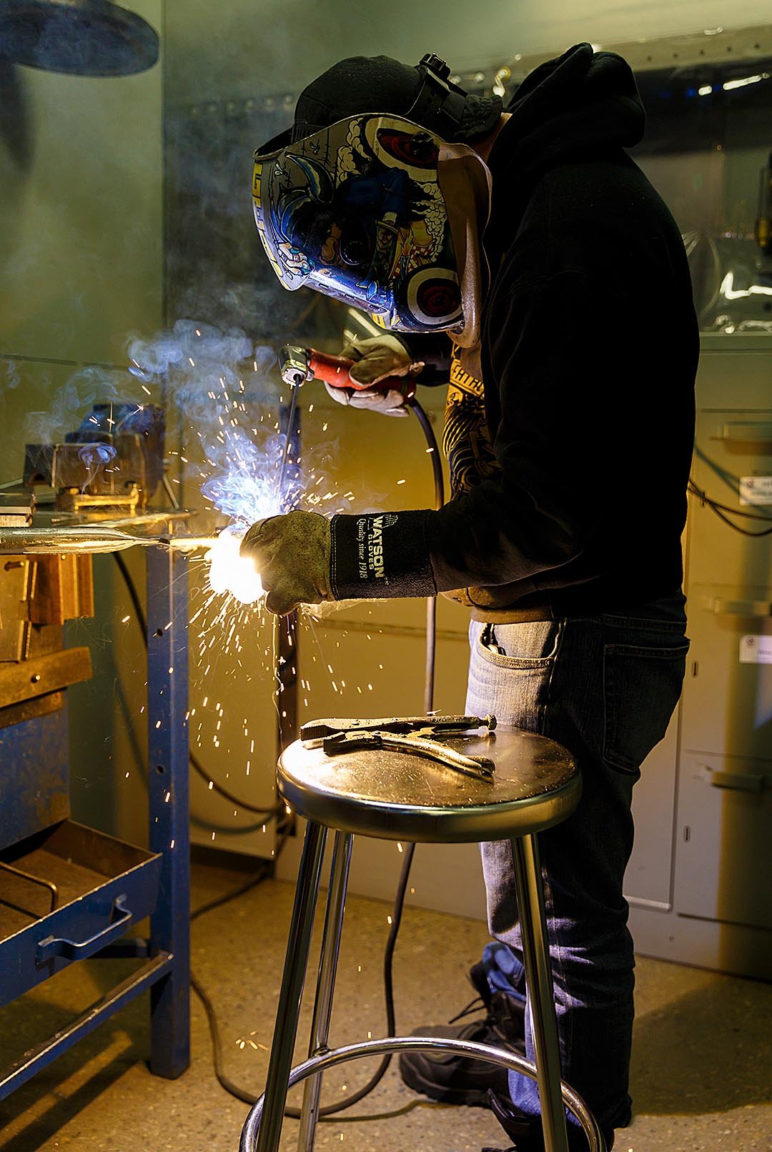 <strong>Sparks Fly: </strong> Efren Flores works on a welding project during class in the Aldred Centre at SAIT in Calgary on Thursday, Feb. 16, 2017. Flores is a first year student with a graduation date set for June 2018. Welding is a 24 week program at SAIT that allows students to get hands on experience with joining and severing metals, as well as learning about the various processes and tools used in the welding industry. (Photo by Dawn Gibson/The Press)