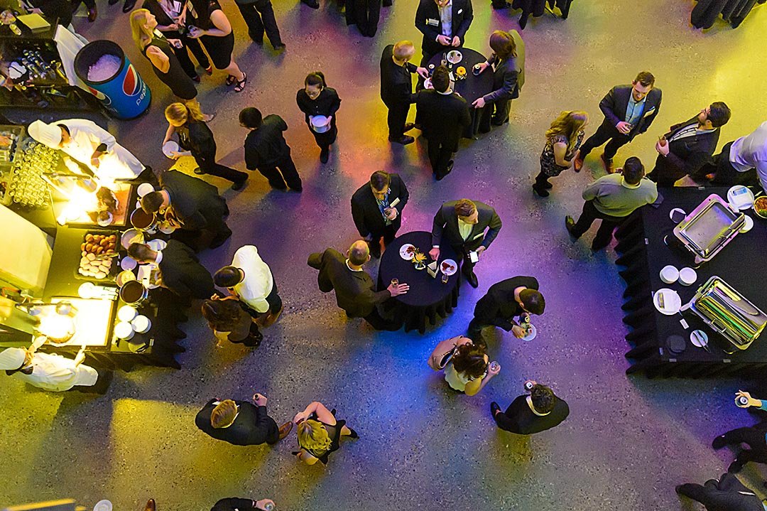 <strong>Looking down on the petroleum industry: </strong> Students and industry professionals mingle during the student petroleum society (SPS) industry night on the first floor of the Johnson-Cobbe Energy Centre in Calgary on Thursday, Feb. 16, 2017. The SPS is a student-run club at SAIT that exists to connect students with industry representatives. (Photo by Ashley Orzel/The Press)