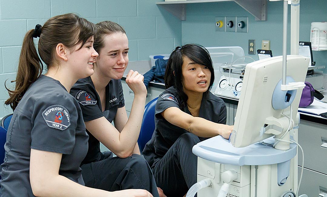 <strong>A Calculated Breath: </strong>Rachel Burick, left, with sister, Olivia Burick participate with Mylinh Hong in a respiratory therapy lab in Calgary on Thursday, Feb. 16, 2017. SAIT's respiratory therapy program lasts for three years and prepares students for a career in hospital emergency rooms and intensive care units. (Photo by Parker Crook/The Press)