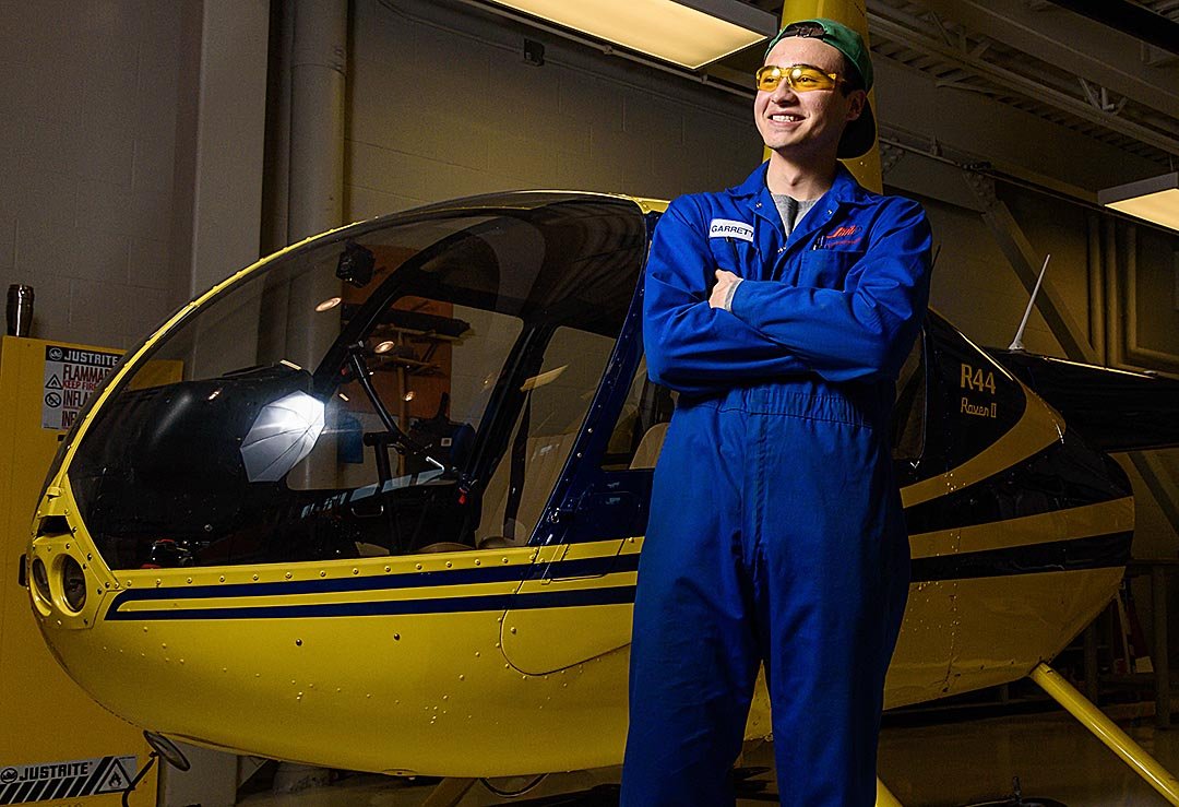 <strong>Head in the Clouds: </strong> Second-year aircraft maintenance engineers technology student Garrett Lee stands for a portrait during a break in his HELI 320 - helicopter maintenance practices class at the Art Smith Aero Centre in Calgary on Thursday, Feb. 16, 2017. The centre is one of three training facilities within SAIT's School of Transportation, along with the Buck Crump Centre for rail training and technology and the Clayton Carroll Automotive Centre. (Photo by Kayla Van Den Bussche/The Press)