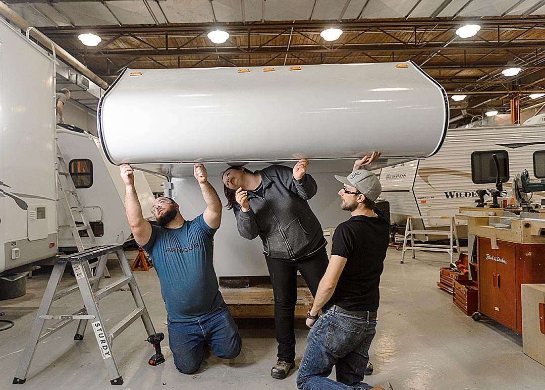<strong>Just in time for camping season: </strong> Second-year School of Transportation, recreation vehicle service technician, apprentices measure one of the finishing pieces on a camper at the N.R. Buck Crump building at SAIT's Mayland Heights campus in Calgary on Thursday, Feb. 16, 2017. The recreational vehicle, which is nearing completion, has taken a year for students to build from scratch. (Photo by Ashley Orzel/The Press)